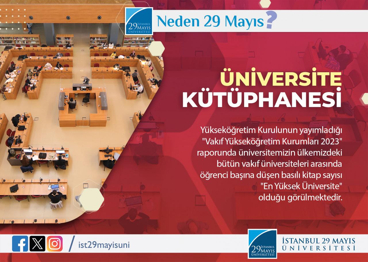 İstanbul 29 Mayıs Üniversitesi “Öğrenci başına en çok kitap düşen vakıf üniversitesi kütüphanesi” unvanını elinde bulunduruyor. İstanbul 29 Mayıs Üniversitesi; 10 bin metrekare kapalı alana sahip olup, 1 milyon cilt kitap, 1.500 kişi oturma kapasiteli zengin kütüphane olanaklarını bünyesinde barındırıyor. Çay ve çorba ikramlarının bulunduğu kütüphanede hafta sonu ve resmi tatiller de dahil olmak üzere haftanın her günü 22.00’ye kadar açık. Sınav dönemlerinde ise 24 saat boyunca öğrencilerin hizmetinde.