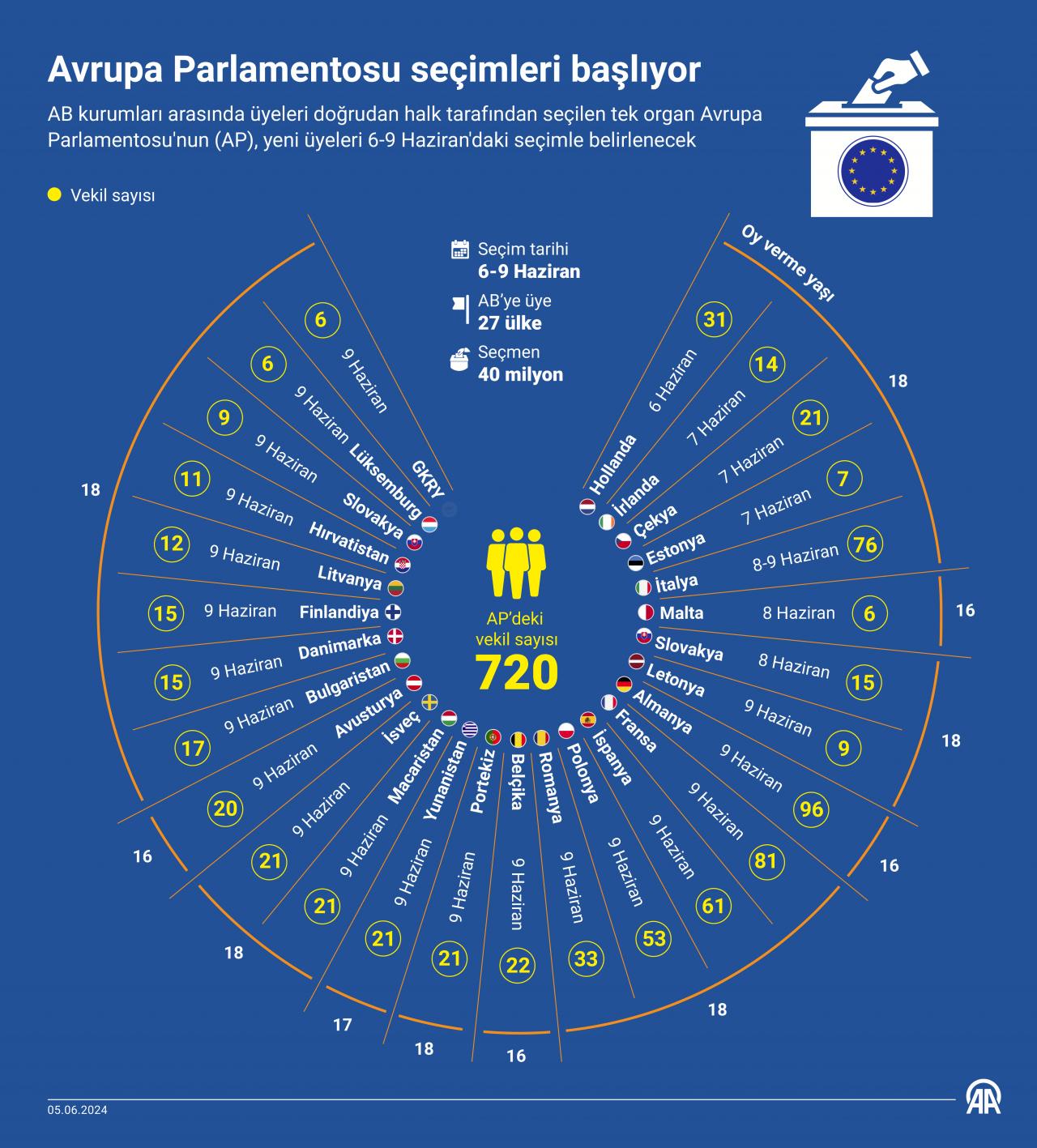 - AB'ye üye 27 ülkede 6-9 Haziran'da gerçekleşecek seçimlerde başlangıcı yarın Hollanda yapacak, en hareketli gün ise 21 ülke seçmeninin sandık başına gideceği 9 Haziran olacak.