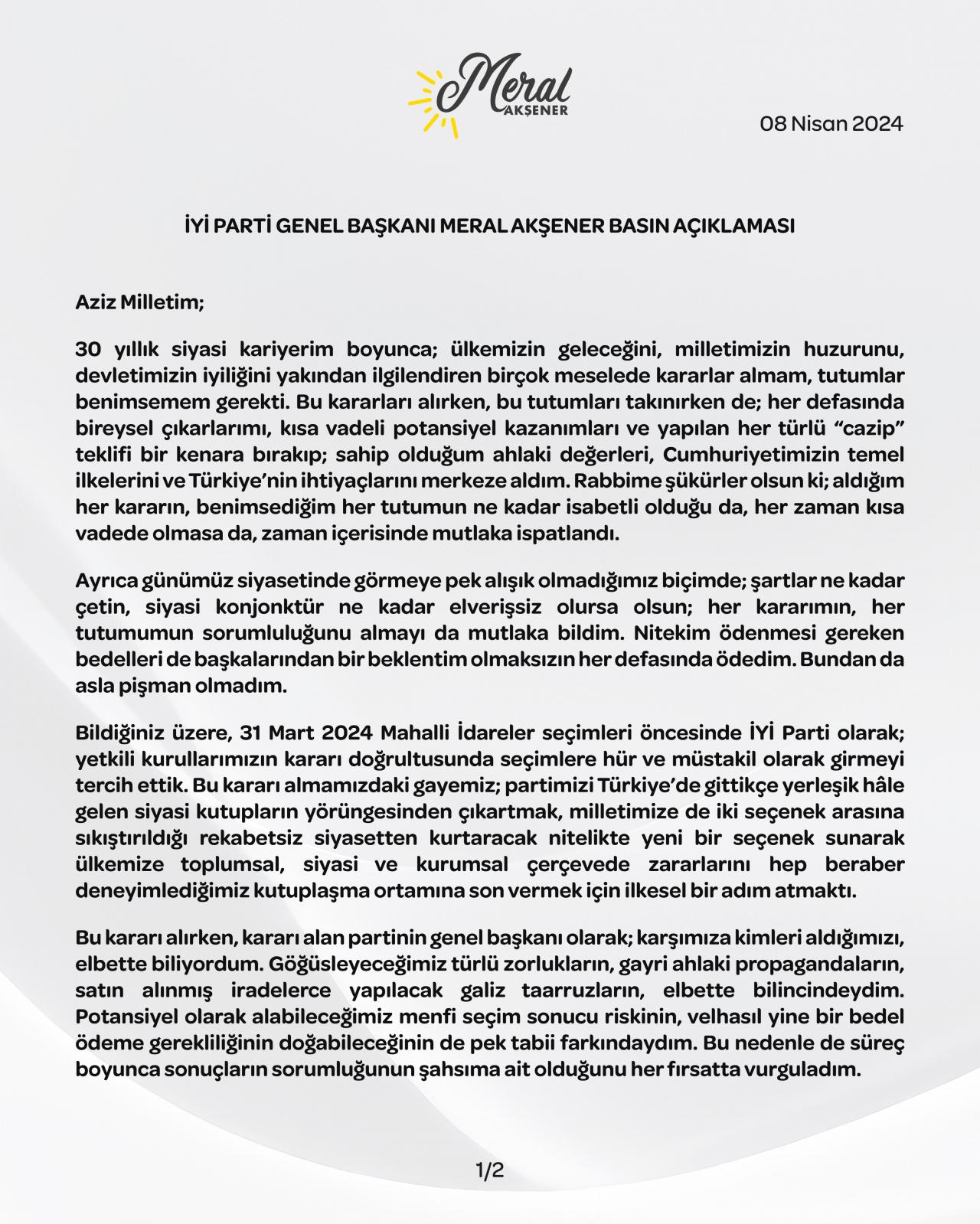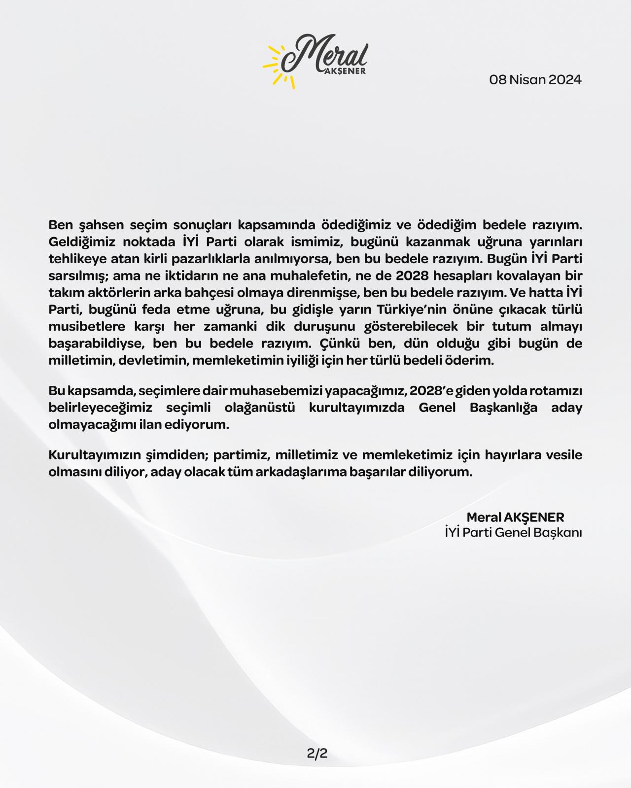 İYİ Parti Genel Başkanı Meral Akşener, seçimli olağanüstü genel kurultayda aday olmayacağını açıkladı. “2028’e giden yolda rotamızı belirleyeceğimiz seçimli olağanüstü kurultayımızda Genel Başkanlığa aday olmayacağımı ilan ediyorum.” ifadelerini kullanan Akşener, aday olacak kişilere başarılar diledi.