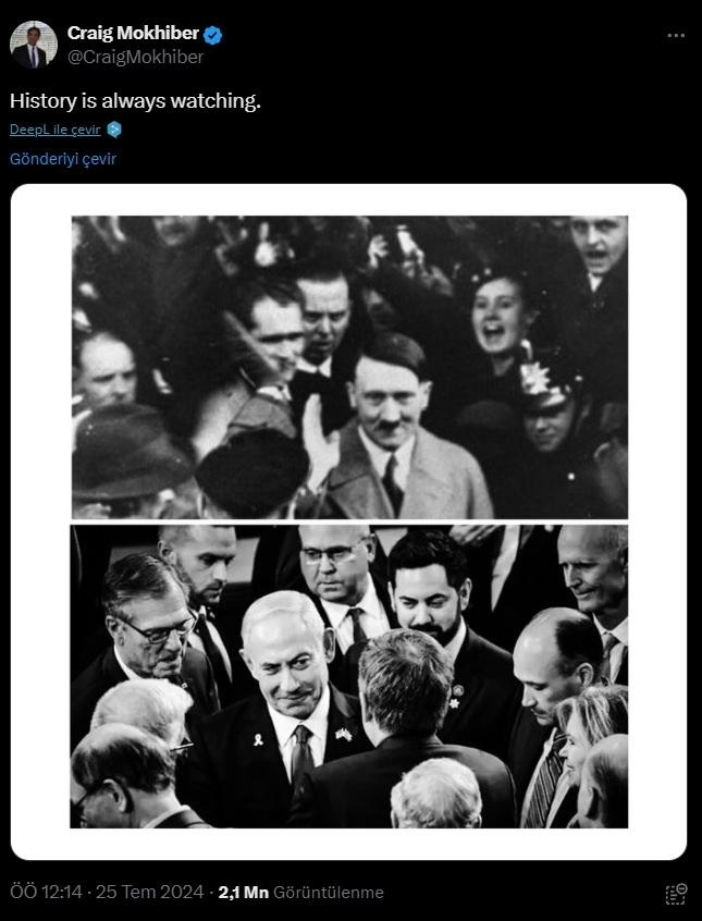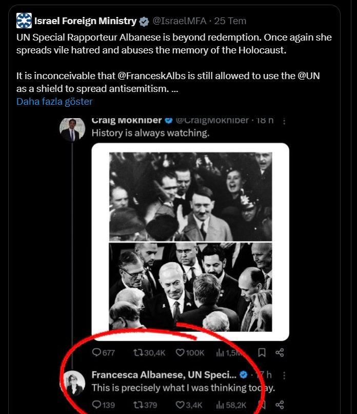 ABD’li uluslararası hukukçu ve eski BM İnsan Hakları Yetkilisi Craig Mokhiber, sosyal medya platformu X’teki hesabı aracılığıyla Netanyahu’nun ABD Kongresi’nde çekilen fotoğrafı ile Adolf Hitler’in yandaşları arasında çekilmiş fotoğrafını yan yana koyarak, “Tarih her şeyi yazıyor” notunu paylaştı. Mokhiber’in mesajını yanıtlayan BM Raportörü Francesca Albanese de gönderiye yorum olarak, “Tam da bugün bunu düşünüyordum” diye yazdı. Albanese’nin cevabı, İsrail ve onun en başta gelen iki destekçisi ABD ve Almanya’yı harekete geçirdi.