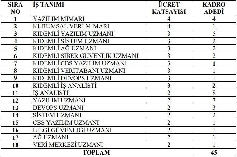 Yazılım, yazılım tasarımı ve geliştirilmesi ile bu sürecin yönetimi konusunda veya büyük ölçekli ağ sistemlerinin kurulumu ve yönetimi konusunda ücret tavanı iki katını geçmeyecekler için en az 3 (üç) yıl, diğer adaylar için en az 5 (beş) yıl mesleki tecrübeye sahip bulunmak, (Mesleki tecrübenin belirlenmesinde; bilişim personeli olarak 657 sayılı Kanuna tabi kadrolu veya aynı Kanunun 4’üncü maddesinin (B) bendi ile 399 sayılı Kanun Hükmünde Kararnameye tabi sözleşmeli statüdeki hizmetler ile özel kesimde sosyal güvenlik kurumlarına prim ödenmek suretiyle işçi statüsünde bilişim personeli olarak geçtiği belgelenen hizmet süreleri dikkate alınır.)