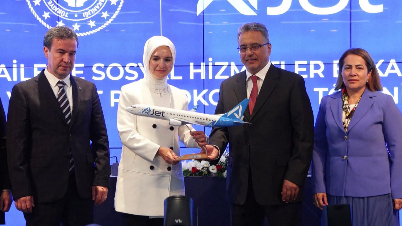 İmzalanan protokol ile ilgili konuşan Aile ve Sosyal Hizmetler Bakanı Mahinur Özdemir Göktaş, “Bugün AJet ile iş birliği çerçevesinde iki protokol imzalamak için bir aradayız. Bu anlamda Bakanlık olarak hizmetlerimize bir yenisini daha eklemenin mutluluğunu yaşıyoruz. İmzalayacağımız bu protokolün sağlayacağı kolaylıklardan faydalanan engelli, şehit yakını ve gazilerimiz için hayırlı olmasını diliyorum. Bugün Türkiye, eğitimden sağlığa, tarımdan sanayiye, ulaşımdan sosyal hizmetlere kadar hayatın her alanında sosyal devlet olma anlayışıyla hareket eden güçlü bir devlettir. Bu kapsamda sayın Cumhurbaşkanımız Recep Tayyip Erdoğan’ın da dile getirdiği gibi devletin şefkat şemsiyesi dışında hiçbir vatandaşımızın kalmaması için en dezavantajlı gruplardan başlayarak vatandaşlarımızın sıkıntılarına çözüm ürettik” dedi.