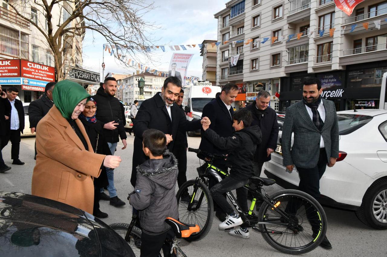 Buradan bir çağrıda bulunuyorum. Tarlası tapanı arsasını gelin biz takas yapalım. Bunları Mansur Bey’e verelim, Mansur Bey de kendindekilieri versin. Turgut Bey Londra’dan mondradan bir şey istemiyor. Çünkü ben diyor, buranın çocuğuyum, benim toprağım burası, benim gelecek kaydım da yok, başka bir kaygım da yok, burada doğrum burada öleceğim. Buradaki tarlayı tapanı gelsin, şehit aileleri vakfımıza adayımız da Mansur Bey de bağışlasınlar, bu sorun da bitsin diyorum. Kamuoyu yanlış bilgilendiriliyor, ABB’de iş yapmayan ve iktidar olmayan Mansur Yavaş, iş yapamadığı için iftira atıyor, biz her yerde kurdele kesiyoruz, gönül isterdi ki hizmette yarışalım.