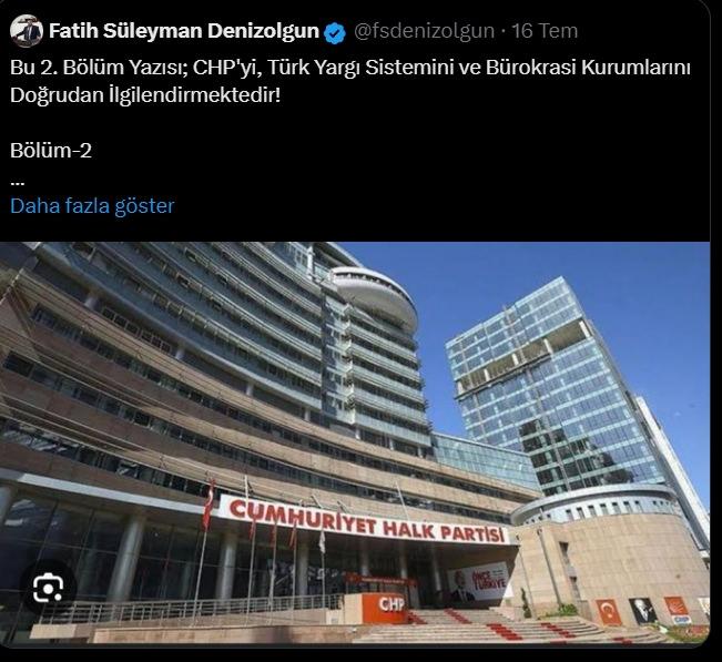 “Bu 2. Bölüm Yazısı; CHP’yi, Türk Yargı Sistemini ve Bürokrasi Kurumlarını Doğrudan İlgilendirmektedir” diyen Fatih Süleyman Denizolgun’un CHP ile ilgili paylaşımı şöyle: