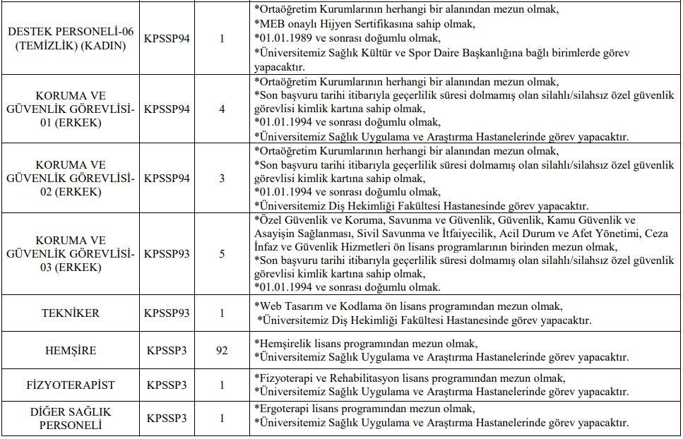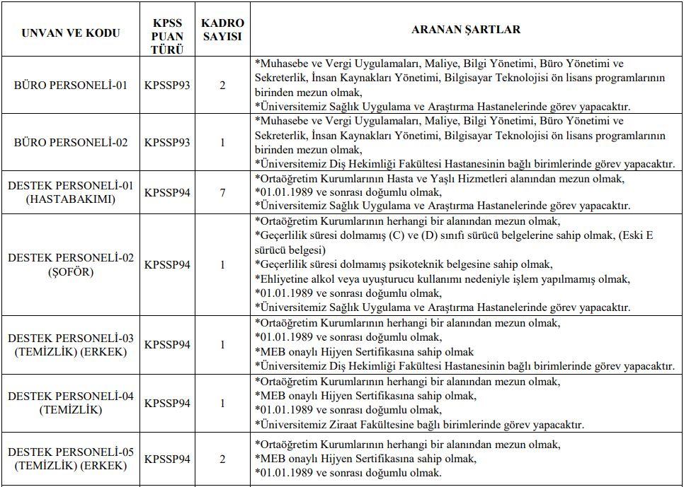 Lise Mezunu: 7 Hasta Bakıcı, 1 Şoför, 5 Temizlik Görevlisi, 7 Koruma ve Güvenlik Görevlisi,