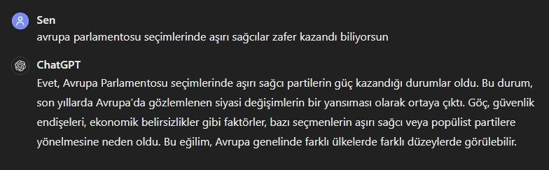 Tüm dünya Avrupa’daki sürpriz seçim sonuçlarını tartışırken Haber7, ‘Avrupa’nın kabusu’ olarak değerlendirilen sonuçları ve olası etkilerini yapay zekaya sordu. Dünyanın en önde gelen yapay zeka uygulamalarından biri olan ChatGPT, Avrupa’daki aşırı sağın yükselişine ilişkin “son yıllarda Avrupa’da gözlemlenen siyasi değişimlerin bir yansıması” olduğunu belirtirken, seçim sonuçlarının nedeninin Göç, güvenlik endişeleri, ekonomik belirsizlikler gibi faktörler olduğunu söyledi.
