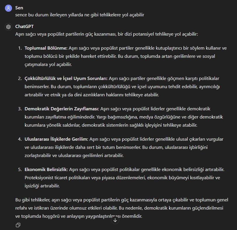 Yapay zeka uygulaması Avrupa’daki aşırı sağın yükselişinin bir dizi potansiyel tehlikelere yol açabileceğini belirtti. ChatGPT olası tehlikeleri şu 5 madde ile sıraladı;