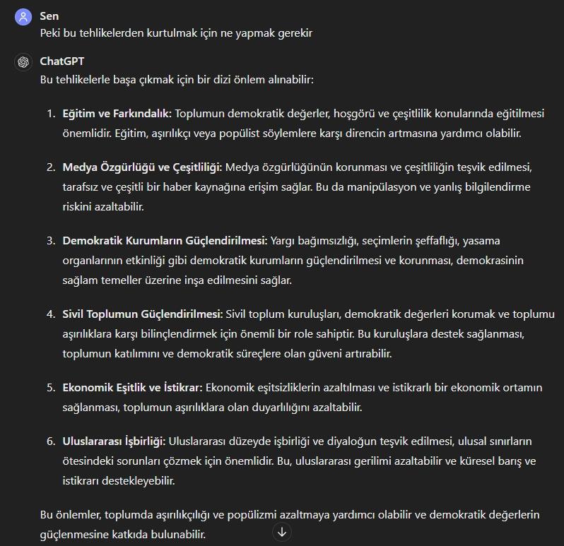Avrupa’daki yeni düzenin potansiyel tehlikelerini sıralayan yapay zeka bu olası tehlikelerden kurtulmanın yollarını da söyledi. ChatGPT, “Bu tehlikelerden kurtulmak için ne yapmak gerekir?” sorusuna “Eğitim ve Farkındalık”ı öne çıkararak şöyle ifade etti;
