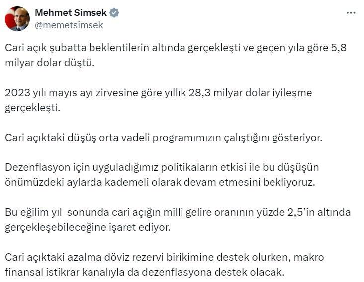 Hazine ve Maliye Bakanı Mehmet Şimşek, şubatta cari açığın beklentilerin altında gerçekleştiğini ve geçen yıla göre 5,8 milyar dolar azaldığını bildirerek, “Bu eğilim, yıl sonunda cari açığın milli gelire oranının yüzde 2,5’in altında gerçekleşebileceğine işaret ediyor.” ifadesini kullandı.