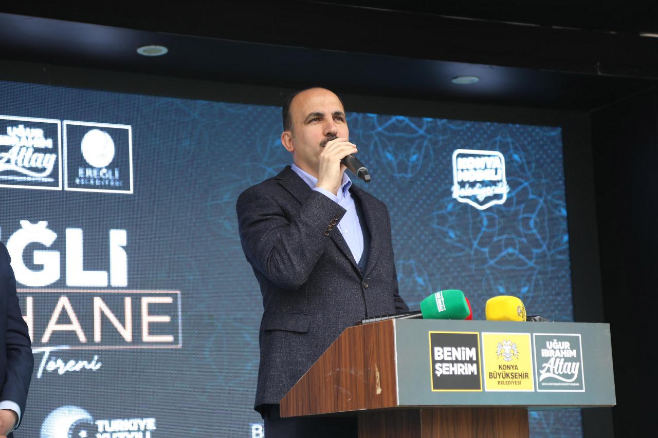 Konya Büyükşehir Belediye Başkanı Uğur İbrahim Altay, 2014 Büyükşehir Yasası’ndan bu yana Ereğli’de önemli işler gerçekleştirdiklerini ifade ederek, ”Ereğli, merkezin dışındaki en büyük ilçemiz. Gün gelip bir yer il olacaksa Ereğli’nin il olması için en başta ben sizinle beraber hareket ederim. Biz bunu bir ayrılık olarak görmeyiz. Ereğlililer neden mutluysa biz ondan mutlu oluruz. Ereğli’nin menfaatine ne varsa Uğur İbrahim Altay, onun altına imza atar” ifadelerini kullandı.