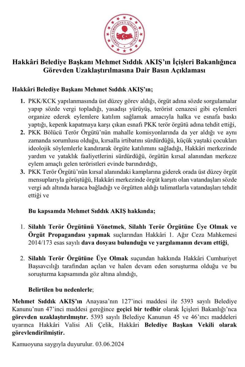 Belirtilen bu nedenlerle; Mehmet Sıddık AKIŞ’ın Anayasa’nın 127’inci maddesi ile 5393 sayılı Belediye Kanunu’nun 47’inci maddesi gereğince geçici bir tedbir olarak İçişleri Bakanlığı’nca görevden uzaklaştırılmıştır. 5393 sayılı Belediye Kanunun 45 ve 46’ıncı maddeleri uyarınca Hakkâri Valisi Ali Çelik, Hakkâri Belediye Başkan Vekili olarak görevlendirilmiştir.”