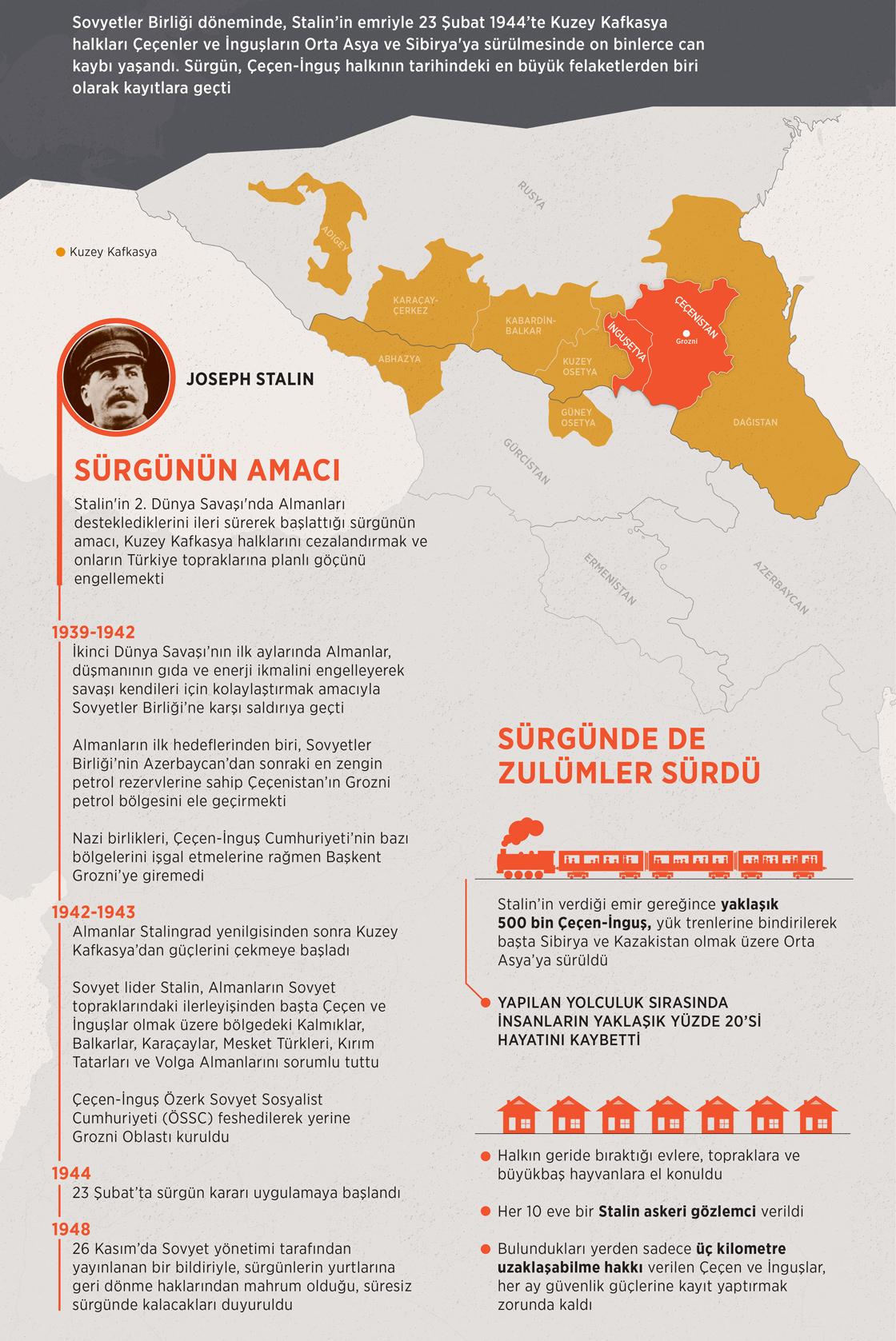 Stalin’in verdiği emir gereğince yaklaşık 500 bin Çeçen-İnguş, yük trenlerine bindirilerek başta Sibirya ve Kazakistan olmak üzere Orta Asya’ya sürüldü. Yalnızca 2 bin kişi dağlara kaçabildi.