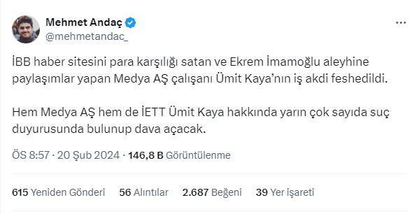 Andaç yaptığı paylaşımda, “İBB Haber” sayfasını para karşılığı satan ve Ekrem İmamoğlu aleyhine paylaşımlar yapan Medya AŞ çalışanı Ümit Kaya’nın iş akdinin feshedildiğini duyurdu.