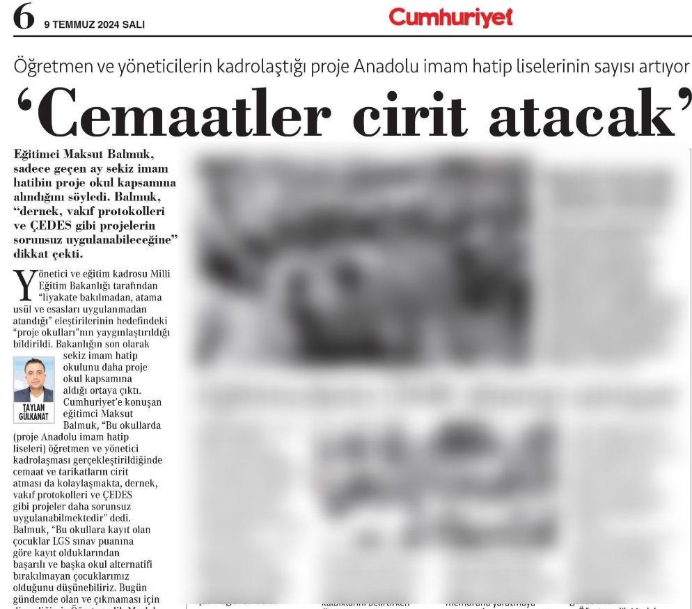 “İmam hatipler dinci yapıların kadrolaşma alanına dönüştü, tarikatların önü açılıyor” başlığıyla imam hatip okullarını hedef alan Cumhuriyet, CHP İstanbul 3. Bölge milletvekili aday adayı, şahsi sitesinde Fatih Mesleki Eğitim Merkezi’nde Matematik Öğretmenliği yaptığı belirtilen Maksut Balmuk‘un ifadelerine yer verdi.