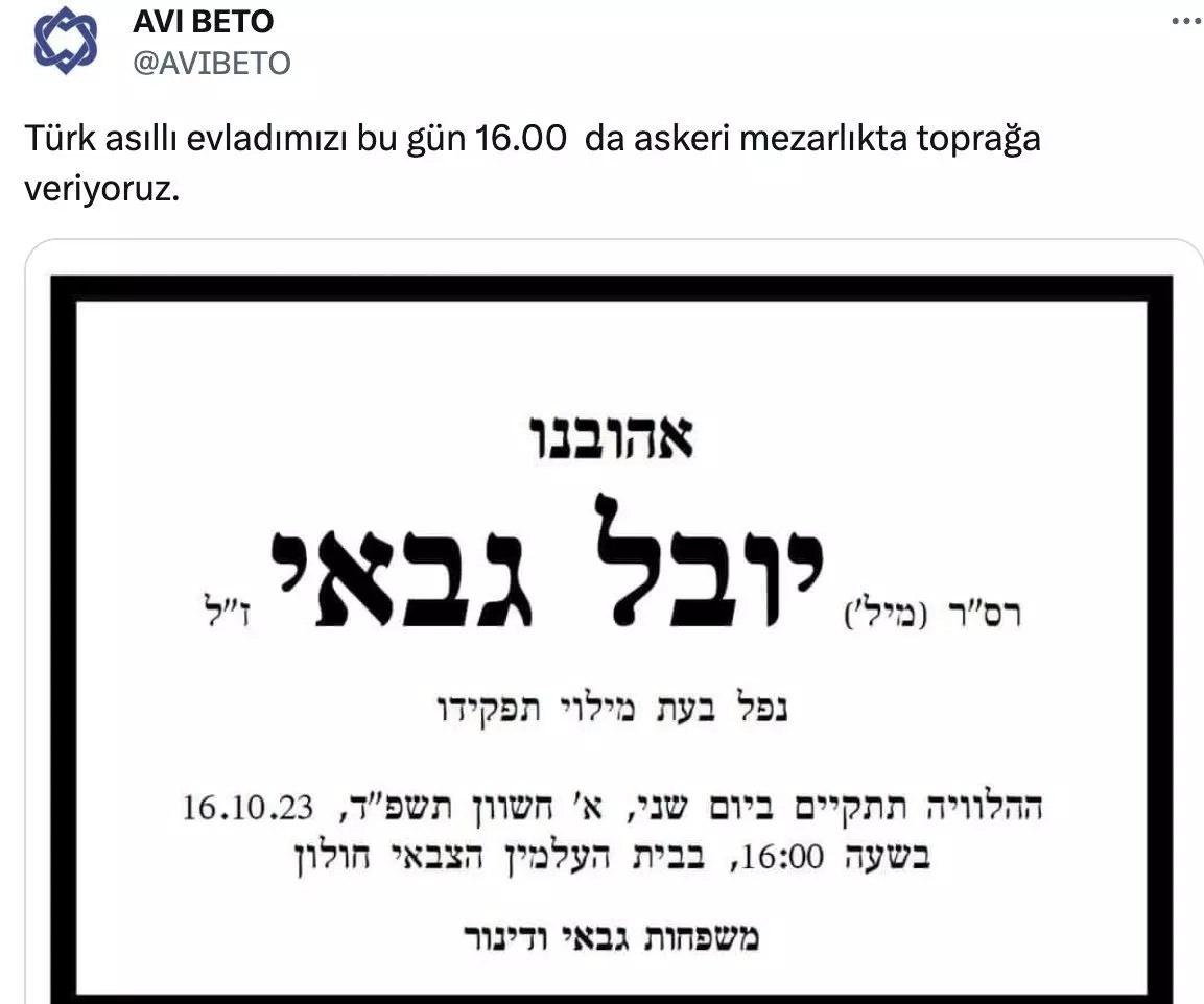 Türk vatandaşı olan siyonist katilin soykırım suçuna karıştığını ifşa eden İsrail, isminin “Yuval Gabbay” olduğu açıklanan İsrailli için taziye mesajı yayımlandı. Kassam Tugayları tarafından öldürülen Türkiye ve İsrail vatandaşı Gabbay’ın yedek binbaşı olarak İsrail ordusunda aktif bir şekilde görev yaptığı öğrenildi.