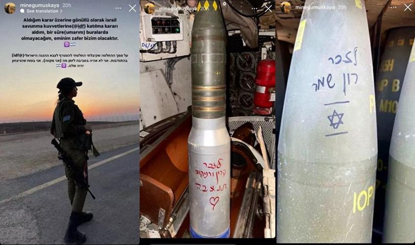 Sosyal medya hesabından yaptığı paylaşımlarda Mine Gümüşkaya, İsrail’in çocuk, kadın, erkek, yaşlı, engelli demeden Gazzeli sivillerin üzerine attığı bombalara İbranice yazılar yazdı ve kalp çizdi.