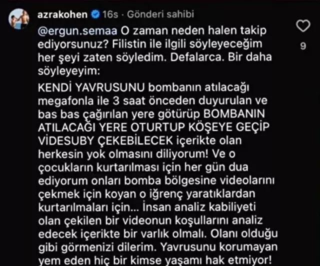 Yahudi bir iş adamıyla evli olan yazar Azra Kohen, Filistinli sivilleri suçlayarak manipülasyonlarda bulundu. Azra Kohen, Refah konusunda paylaşım yapmamasını eleştiren bir takipçisine verdiği cevapta Filistinlilerin çocuklarını, ‘3 saat önceden uyarılar yapılmasına rağmen bombaların atılacağı yerlere bilerek götürdüğünü‘ söyledi. Kohen, “Yavrusunu korumayan yem eden hiçbir kimse yaşamı hak etmiyor” yorumu yaptı. Siyonist Kohen’in bu sözleri büyük tepki çekti.