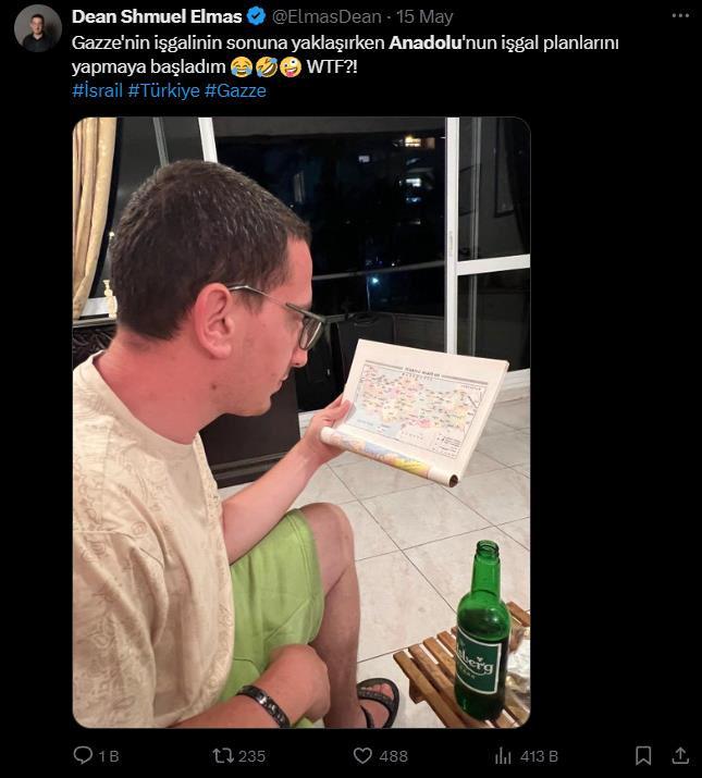 Türk vatandaşı olduğu iddia edilen ve Türkçe gönderiler paylaşan Dean Shmuel Elmas isimli siyonist, Türkiye’yi hedef alan bir paylaşım yaptı. Türkiye’nin bulunduğu bir haritayı tuttuğu bir fotoğrafını soykırımcı siyonist, “Gazze’nin işgalinin sonuna yaklaşırken Anadolu’nun işgal planlarını yapmaya başladım” ifadesini kullanarak sözde ironi yaptı. Siyonist Elmas, bu ifadeleriyle büyük tepki çekti.