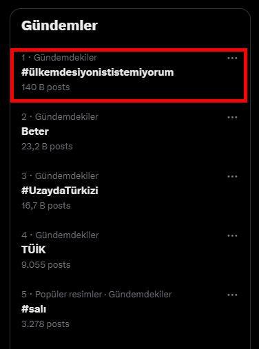 Kanun teklifine sosyal medya kullanıcısı vatandaşlardan büyük destek geldi. Dün akşam saatlerinde açılan "#ülkemdesiyonististemiyorum" etiketi, kısa sürede atılan on binlerce gönderi sonucu Türkiye gündeminde 1. sıraya yükseldi. Sabah saatlerine kadar 140 bin gönderiyi aşan etiket, 1. sıradaki yerini korumaya devam ediyor.