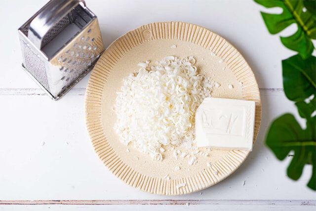 Sabunu Rendeleyin: Ev yapımı çamaşır makinesi deterjanı yapmak için bir rende yardımıyla kalıp sabunu ince parçalar olacak şekilde rendeleyin. Oluşan sabun rendesinden iki su ardağı kadarını büyük bir karıştırma kabının içerisine alın ve kalanını bir sonraki ev yapımı çamaşır makinesi deterjanı yapımına kadar saklayın.