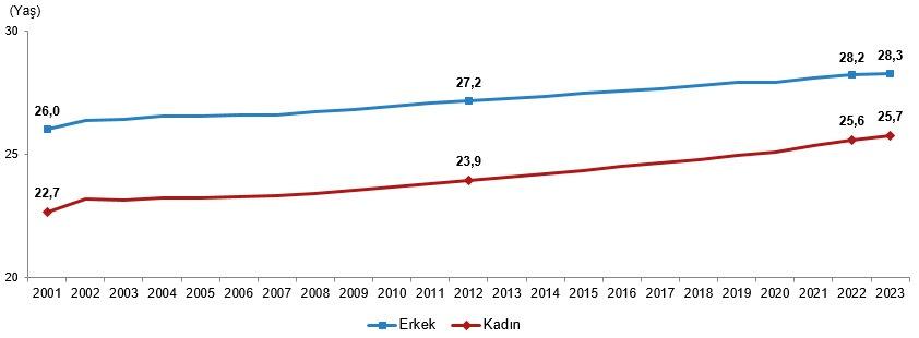23 sene önce kadınlar ortalama 22 yaşında evlenirken bugün artık 25 yaşın sonlarında nikah kıyıyor. Erkekler 2001 yılında ortalama 26 yaşında evlenirken 2023’te evlenme yaşı 28,3’e çıktı.