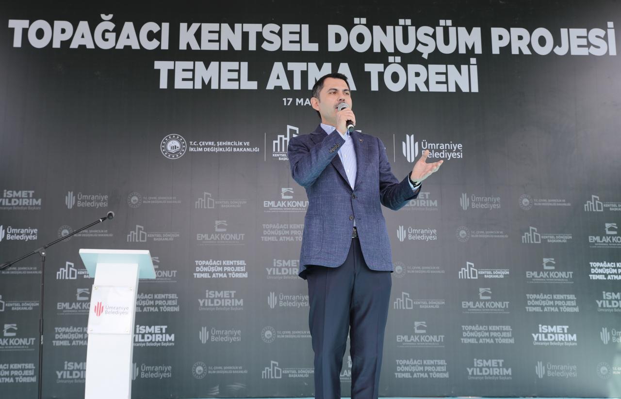Ümraniye’nin ve Topağacı‘nın geleceği adına çok önemli bir adımı attıklarını belirten Murat Kurum, “Ramazan’ın bereketi ile her gün yeni bir temel atma töreninde, her gün yeni bir açılışta bir araya geliyoruz. Burada olduğu gibi yine yeni yuva heyecanıyla dolu siz kardeşlerimizle kucaklaşıyoruz. Dün yine Zeytinburnu’nda 5 bin konutun Çevre Bakanlığımız öncülüğünde hem yıkımlarını hem de temel atmalarını gerçekleştirdik. Burada 1174 bağımsız bölümden oluşan projenin temellerini atıyoruz. Şu 2 günlük yaptığımız iş koca 5 yılda İstanbul Büyükşehir Belediyesi’nin yaptıklarından daha fazla. ‘İş bilenin, kılıç kuşananın’ demişler. Siz dertli olursanız, İstanbul’la Ümraniye ile ilgili hayalleriniz olursa bu hayalleri de teker teker gerçekleştirirsiniz. Risksiz, afetlere hazır İstanbul’a giden yolun çok kıymetli bir zincirini daha atmanın mutluluğuyla buradayız. İstiyoruz ki İstanbul’da hiçbir annemiz, hiçbir evladımız yastığa başını koyduğunda huzursuz uyumasın ve çocuklarıyla, ailesiyle mutlu, huzurlu bir şekilde yaşasın istiyoruz.” diye konuştu.