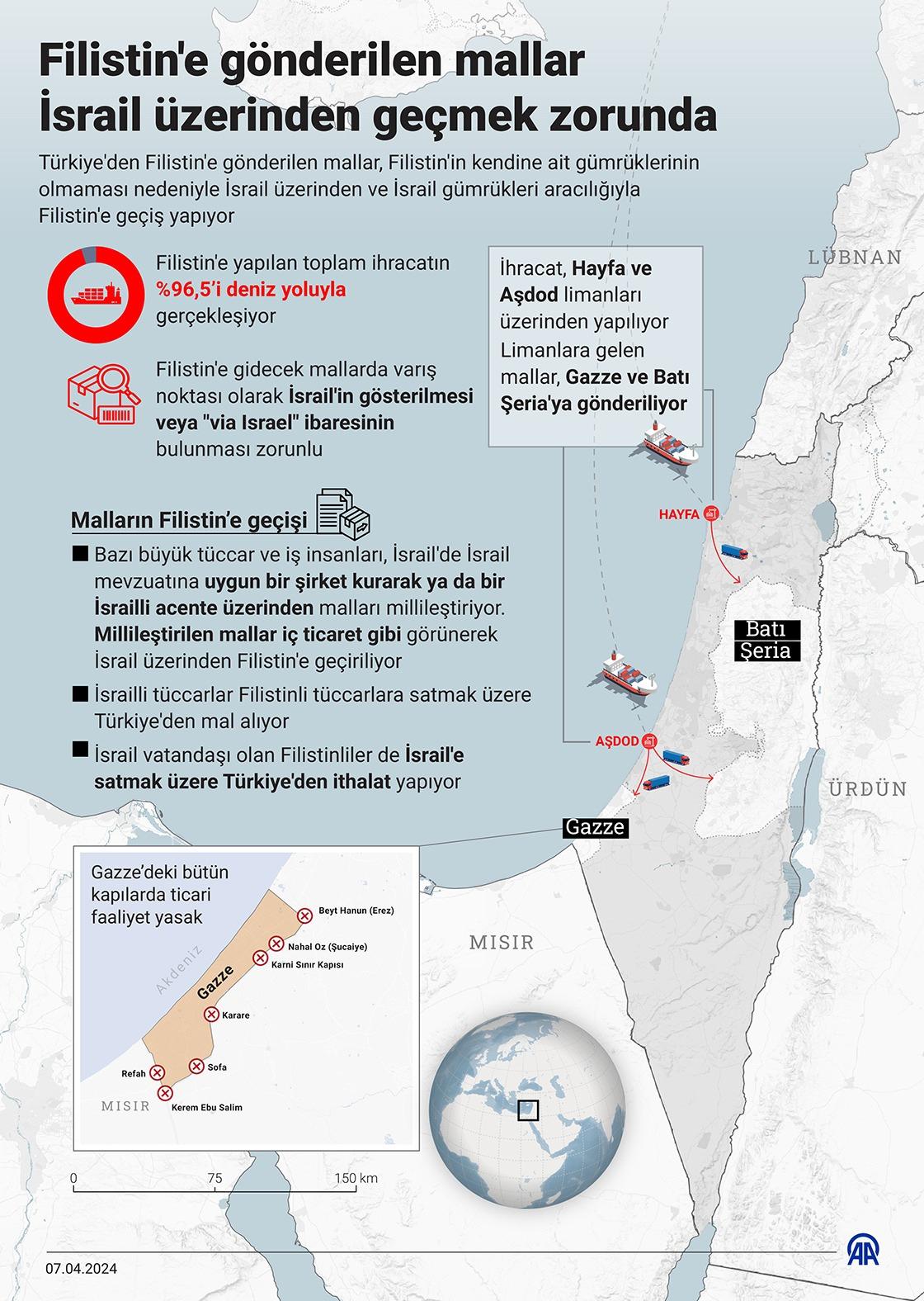 Türkiye’den Filistin’e yönelik gönderilen mallar, Filistin’in kendine ait gümrüklerinin olmaması nedeniyle İsrail üzerinden ve İsrail gümrükleri aracılığıyla Filistin’e geçiş yapıyor. Filistin’e gelecek mallarda varış noktası olarak İsrail’in gösterilmesi veya “via Israel” ibaresinin bulunması zorunlu tutuluyor. Ayrıca İsrail tarafından Oslo anlaşmaları gösterilerek, Üçüncü ülkelerin Filistin ile doğrudan kurduğu yasal ilişkiler de İsrail tarafından tanınmıyor.
