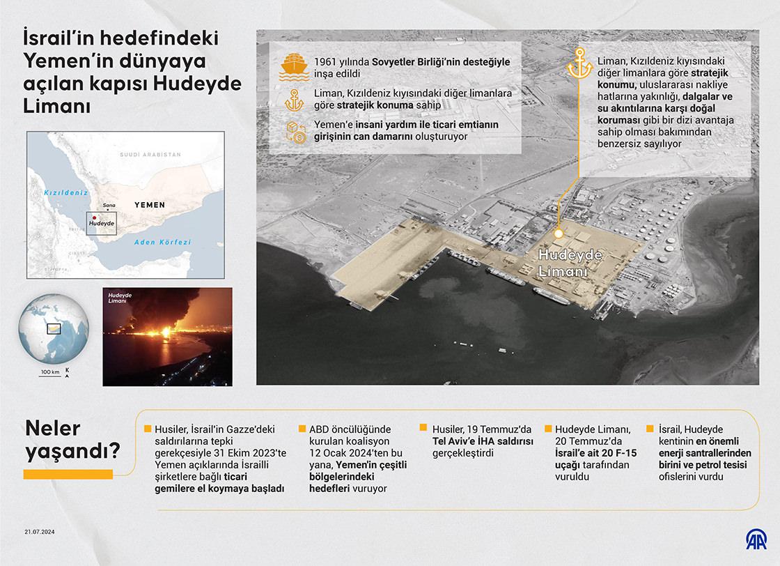 İsrail’in Hudeyde Limanı’na saldırısı, Binyamin Netanyahu hükümetinin açıklamasına göre, Husilerin 19 Temmuz’da Tel Aviv’e gerçekleştirdiği insansız hava araçlı saldırıya karşılık olarak verildi.