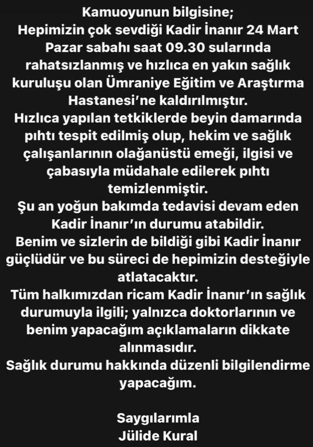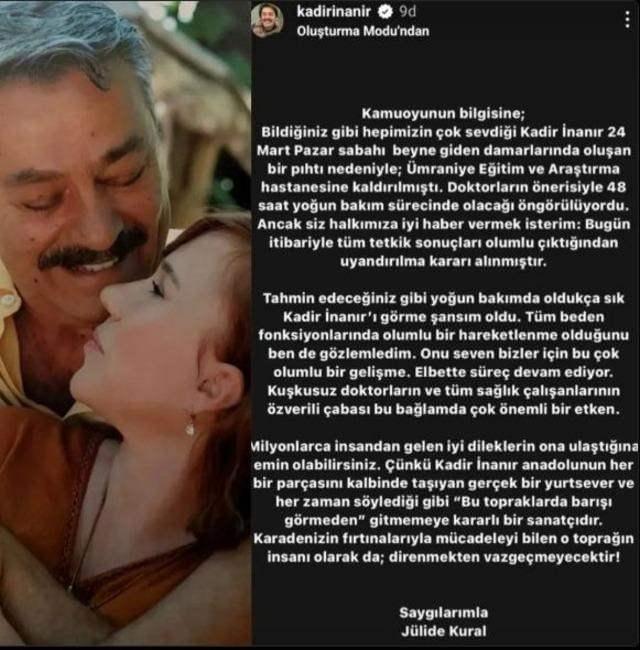 Yeşilçam’ın usta sanatçılarından Kadir İnanır, geçtiğimiz pazar günü sabah saatlerinde evinde rahatsızlanarak hayat arkadaşı Jülide Kural’ın hiç vakit kaybetmeden 112’yi araması sonucu ambulansla Sağlık Bilimleri Üniversitesi, Ümraniye Eğitim ve Araştırma Hastanesi’ne kaldırıldı.