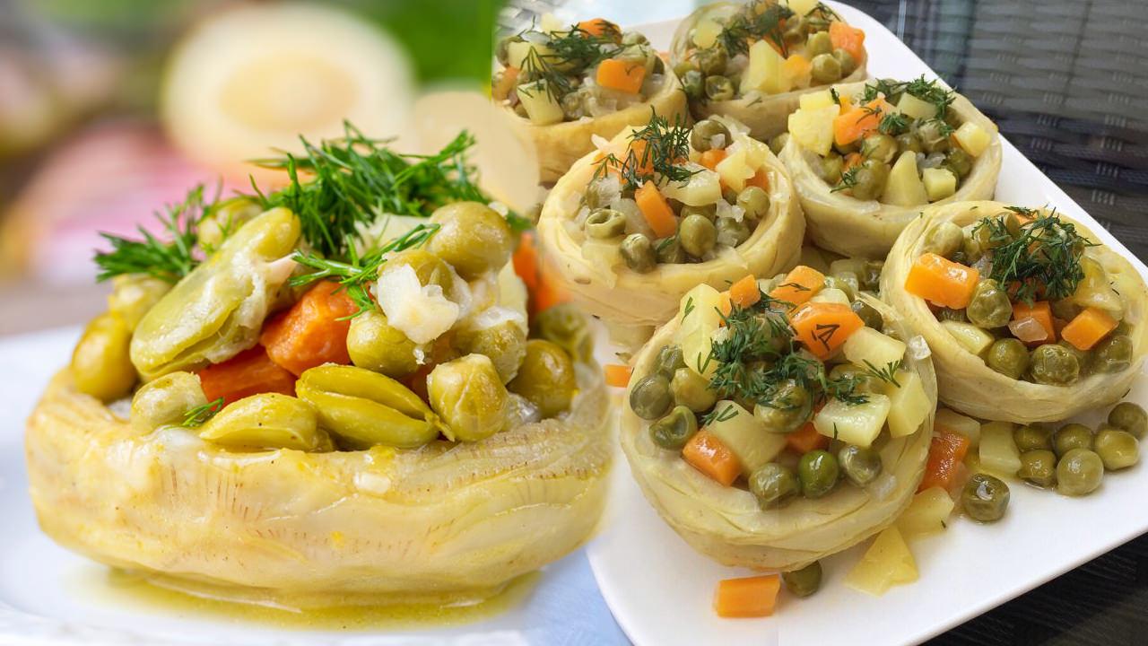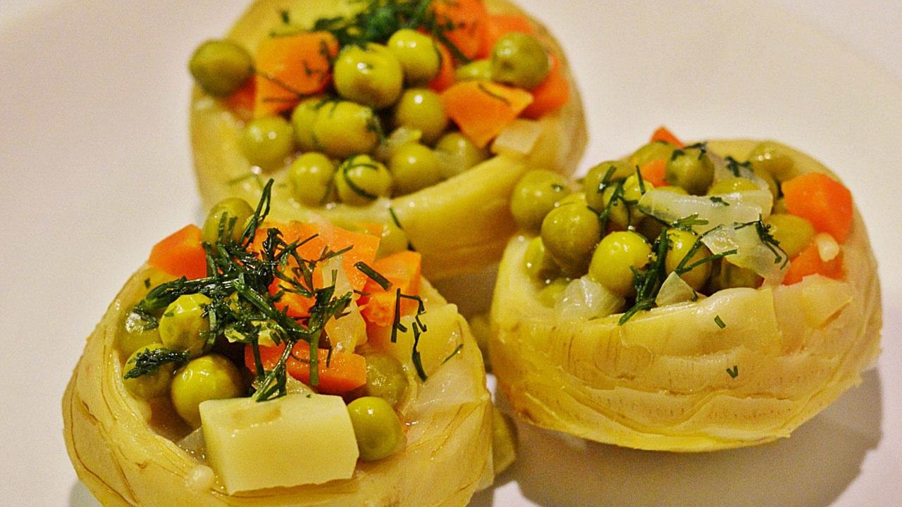 Enginarların orta kısımlarına hazırlanan sebzelerden pay edilir. Kalan garnitür de enginarların üzerine serpilir.