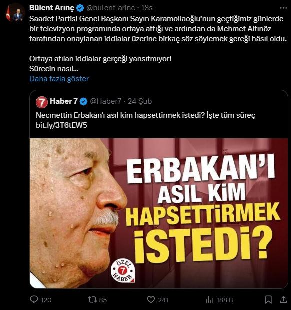 Karamollaoğlu'nun iddiaları üzerine Haber7 Necmettin Erbakan gerçeğini deşifre etti. Haber7 yaptığı özel haberiyle Merhum Erbakan'ın hapse girmemesi için Cumhurbaşkanı Erdoğan ve AK Parti hükümetinin elinden geleni yaptığı kronolojik sırasıyla haberleştirildi. Haberimizin gerçekleri gün yüzüne çıkarmasının ardından 22. Dönem TBMM Başkanı Bülent Arınç, sosyal medya hesabından haberi alıntılayarak Karamollaoğlu'nun iddialarının yalan olduğunu belirtti. Arınç yaptığı paylaşımla o dönem yaşananları tek tek anlattı.