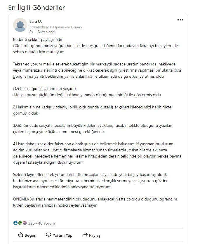 “Bu bir teşekkür paylaşımıdır, Günlerdir gündeminizi yoğun bir şekilde meşgul ettiğimin farkındayım fakat iyi bir şeylere de sebep olduğu için mutluyum. Tekrar ediyorum marka severek tükettiğim bir markaydı sadece üretim bandında, nakliyede veya muhafaza da sıkıntı olabileceğine dikkat çekerek ilgili iyileştirme yapılması bir ufakta olsa gönül alma yanıtı beklerdim yanlış anlaşılma ile ülkemizde dalga etkisi yaratmış oldu. Özetle aşağıdaki çıkarımları yaşadık 1.İnsanımızın güçlünün değil haklının yanında olduğunu elbirliği ile göstermiş oldu 2.Halkımızın ne kadar vicdanlı, birlik olduğunda güzel işler çıkarabileceğimizi hep birlikte görmüş olduk 3.Günümüzde sosyal mecraların büyük kitleleri ayaklandıracak nitelikte olduğunu, yazılan çizilen hiçbir şeyin küçümsenmemesi gerektiğini de 4.Liste daha uzar gider fakat son olarak şunu da belirtmek istiyorum ki yaşanan bu durum eğitim kurumlarında, üretici firmalarda, hizmet sunan firmalarda , tüketicilerde aklımıza gelebilecek neredeyse hemen her kesime hitap eden ders niteliğinde bir olaydır herkes payına düşeni fazlasıyla aldığını düşünüyorum Sizlerin kıymetli destek yorumları hatta mesajları sayesinde yeni birşey başarmış olduk herbirinize ayrı ayrı teşekkür ediyorum, her birinize karşılık vermeye çalışıyorum gözden kaçırdıklarım dönemediklerimin anlayışına sığınıyorum ÖNEMLİ-Bu arada hanımefendinin okuduğunu anlayacak yasta çocuğu olduğunu öğrendim lütfen paylaşımlarınızda incitici seyrel yazmayın” |