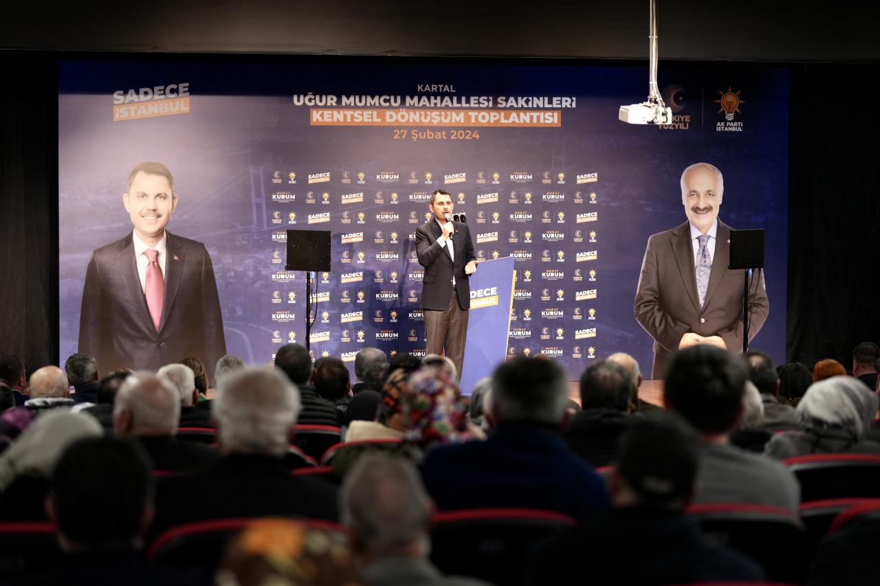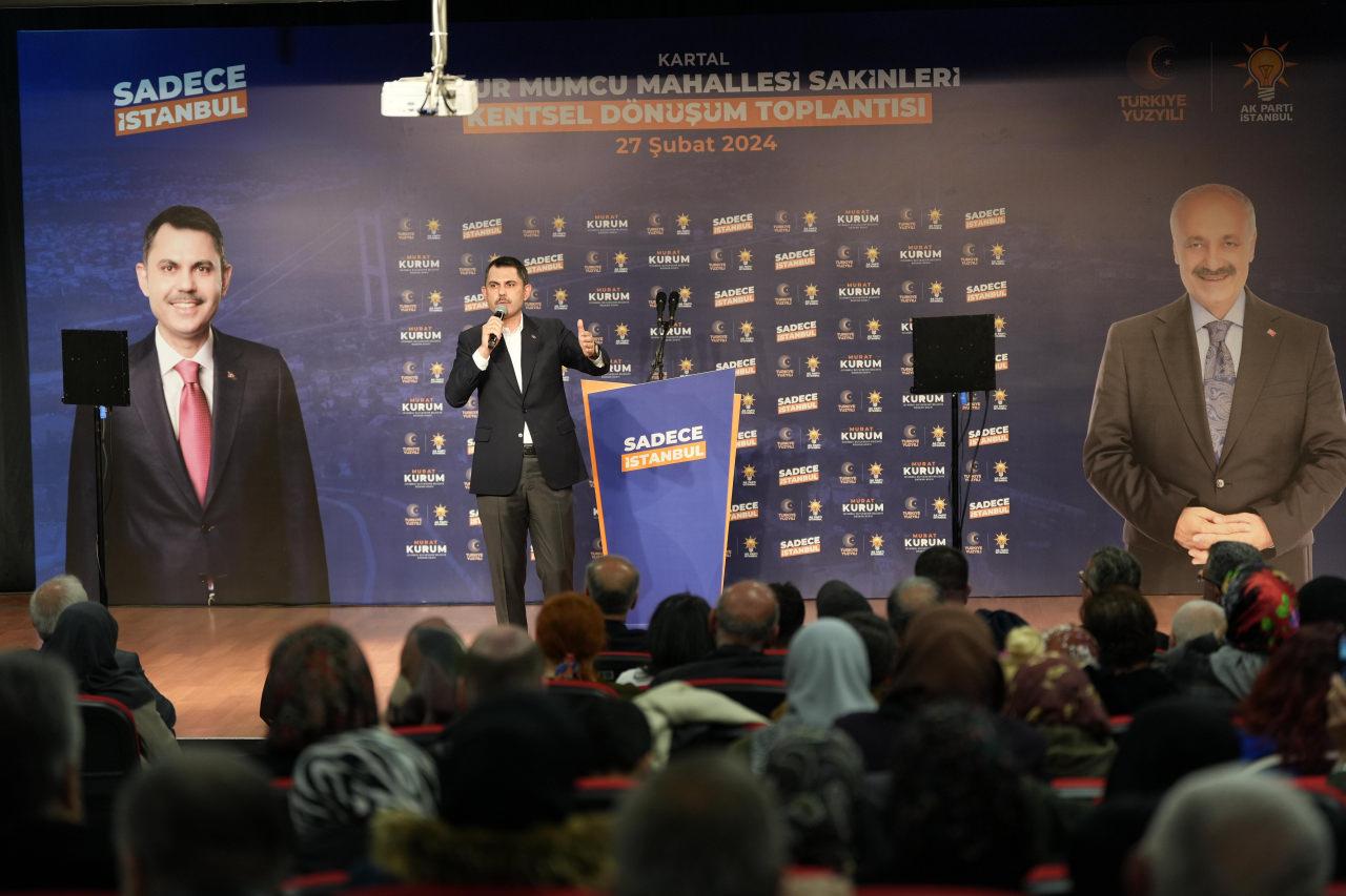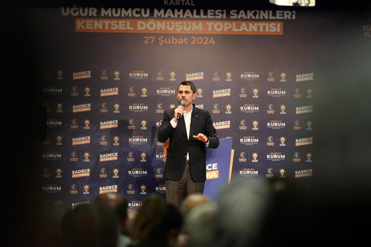 Kurum; Kartal Orhantepe Millet Bahçesi, Çavuşoğlu Millet Bahçesi, Orhantepe kentsel dönüşüm süreci, Kartal’da 20 bine yakın konutun kentsel dönüşüme alınması gibi hizmetlerini hatırlatarak; “Bugün de buraya, sizin de ifade ettiğiniz gibi, ‘Murat Kurum söz verirse yapar’ güveniyle, inancıyla geldik.” dedi. 6 Şubat depreminin ardından, depremzedeler için durmaksızın çalıştıklarını ifade eden Kurum, “Üç ayda, 11 ilimize 180 bin konutun inşasını başlattık ve 15 gün önce de konutlarımız teslim edilmeye başladı.” diyerek; “Bu anlayışla, 1 Nisan’dan sonra da benim ağzımdan bir söz duyuyorsanız, o söylediğimiz projemizi, hayalimizi, her sözümüzü yerine getireceğiz. Hiçbir sözümüz askıda kalmayacak, hiçbir sözümüzü sümen altı yapmayacağız.” dedi.