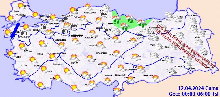 Parçalı ve çok bulutlu, bölge’nin iç kesimleri ile Samsun, Trabzon ve Ordu çevrelerinin yerel sağanak yağışlı geçeceği tahmin ediliyor. Doğu Karadeniz’in yüksek kar örtüsüne sahip eğimli yamaçlarında çığ tehlikesi, kar erimeleri ve heyelan riski bulunmaktadır.