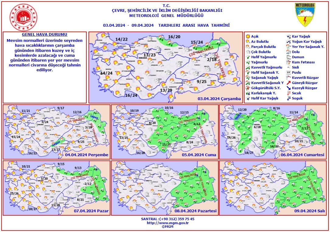 Yapılan son değerlendirmelere göre; yurdun kuzey, iç ve batı kesimlerinin parçalı bulutlu, Sinop, Rize ve Artvin çevreleri ile Samsun'un batı ilçeleri ve Trabzon'un doğusunun aralıklı sağanak yağışlı, Ardahan çevrelerinin karlakarışık yağmur yükseklerinin kar yağışlı, diğer yerlerin az bulutlu ve açık geçeceği tahmin ediliyor. Marmara ve Ege'de hafif toz taşınımı bekleniyor. Doğu Karadeniz’in iç kesimleri ile Doğu Anadolu’nun kuzey ve doğusunda çığ tehlikesi, kar erimeleri ve heyelan riski bulunmaktadır.