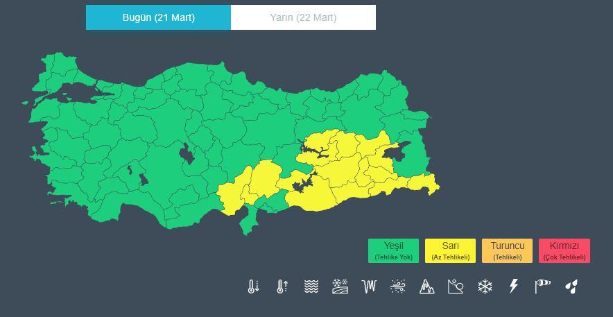 Sağanak beklenen Adana, Kahramanmaraş, Mardin, Osmaniye ile karla karışık yağmur ve kar beklenen, Adıyaman, Bingöl, Bitlis, Diyarbakır, Elazığ, Hakkari, Muş, Siirt, Tunceli, Batman ve Şırnak için "sarı" kodlu uyarıda bulunuldu.