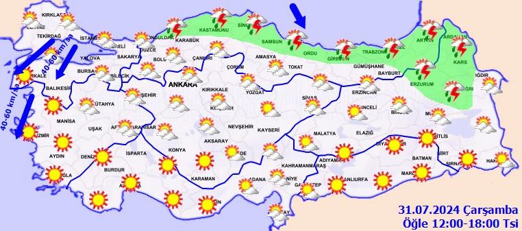 Parçalı ve çok bulutlu, Orta ve Doğu Karadeniz kıyıları ile Artvin çevrelerinin aralıklı sağanak ve gök gürültülü sağanak yağışlı geçeceği tahmin ediliyor. Yağışların Doğu Karadeniz kıyılarında yer yer kuvvetli olması bekleniyor. Rüzgarın Orta Karadeniz kıyılarında kuzeyli yönlerden kuvvetli (40-60 km/saat) esmesi bekleniyor.