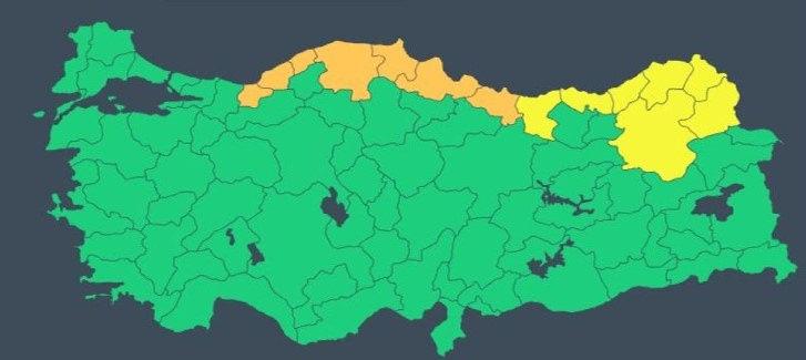 Kastamonu, Sinop, Zonguldak, Ordu, Samsun, Bartın ve Düzce için turuncu kod verilirken; Artvin, Giresun, Rize, Ardahan, Erzurum, Kars ve Trabzon için sarı kod verildi.