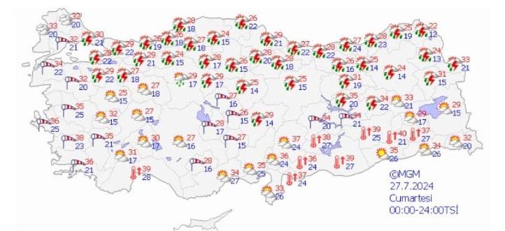 Marmara’nın doğusu, İç Anadolu’nun kuzeydoğusu, Karadeniz, Doğu Anadolu’nun kuzeyi, Ankara çevreleri, Mersin'in doğusu, Adana'nın güney ve batısı ile Hatay'ın kıyı kesimlerinin yerel olmak üzere sağanak ve gök gürültülü sağanak yağışlı geçeceği tahmin ediliyor. Yağışların, Karadeniz kıyıları, Artvin, Kars ve Ardahan çevreleri ile Erzurum'un kuzey kesimlerinde yer yer kuvvetli olması bekleniyor.