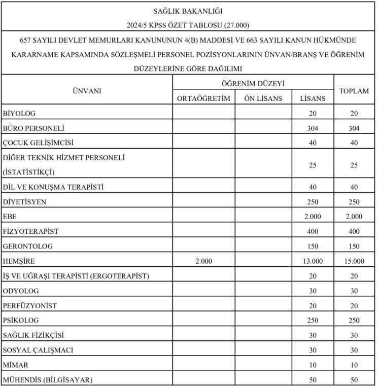 Sağlık Bakanlığı merkez ve taşra teşkilatı hizmet birimlerinde istihdam edilmek üzere 657 sayılı Devlet Memurları Kanunun 4 üncü maddesinin (B) fıkrası ve 663 sayılı Kanun Hükmünde Kararnamenin 45/A maddesi kapsamında 27.000 sözleşmeli personel Kamu Personel Seçme Sınavı (KPSS) sonucuna göre ÖSYM tarafından yapılacak merkezi yerleştirme ile alınacaktır.