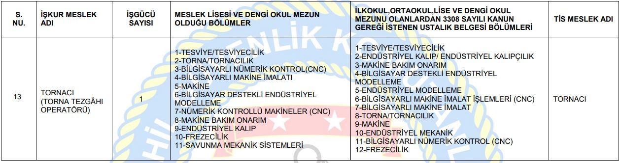 Adayların son başvuru tarihi itibariyle ilanda yer alan iş gücü taleplerinin karşılarında belirtilen okul bölümlerinin birinden mezun olması veya son başvuru tarihi itibarıyla ilanda belirtilen ustalık belgelerinin birine sahip olması ve belirtilen diğer özel şartları sağlaması gerekmektedir. (Ustalık belgesine hak kazanmasına rağmen, son başvuru tarihi itibarıyla belgesi düzenlenmemiş olanlar da başvuru yapabileceklerdir. Ancak, belge kontrollerinde adayların bu durumu ispatlayıcı belge ibraz etmeleri gerekmektedir.) Hâlihazırda Örgün Öğretime Devam Edenler Başvuruda Bulunamaz.