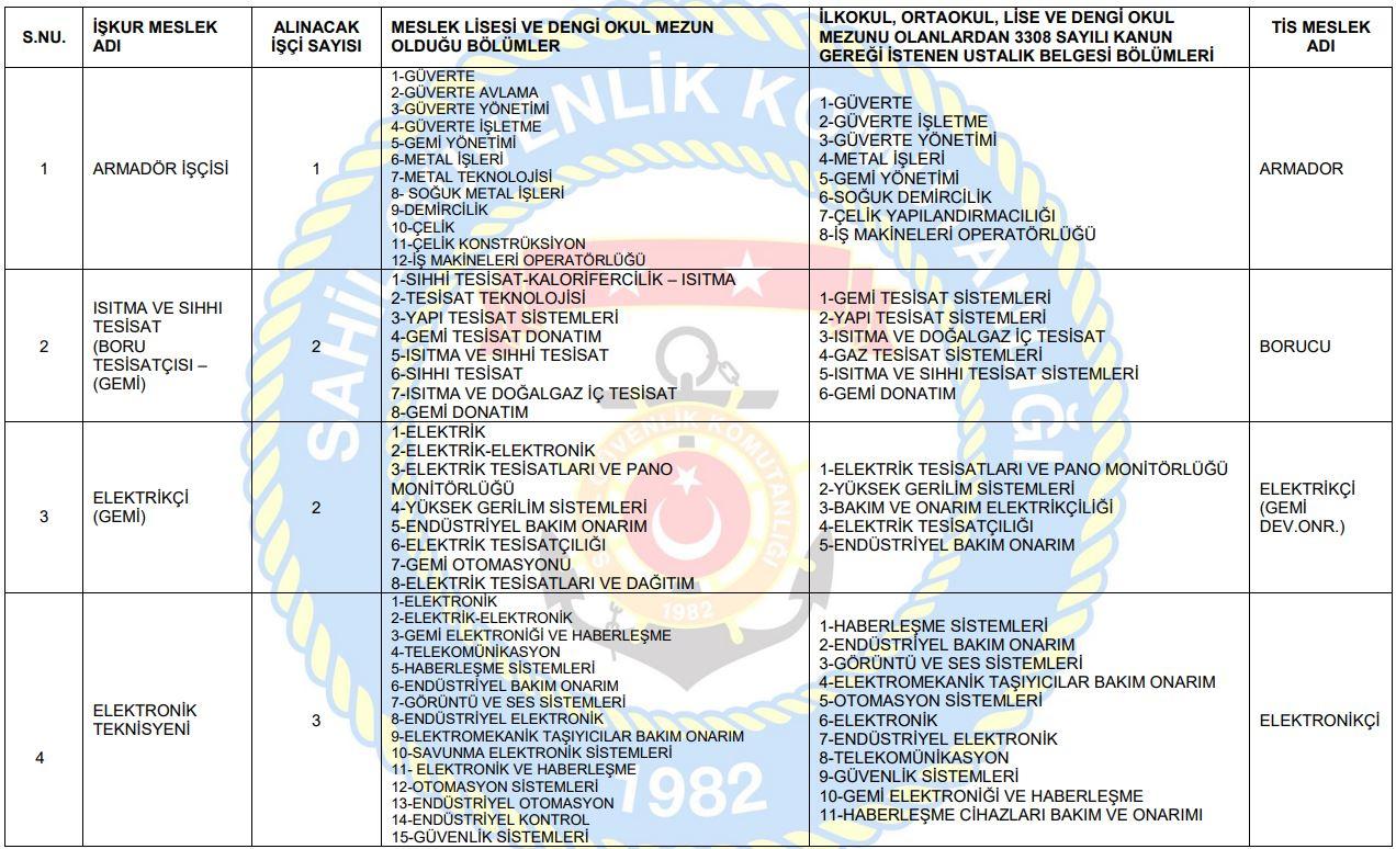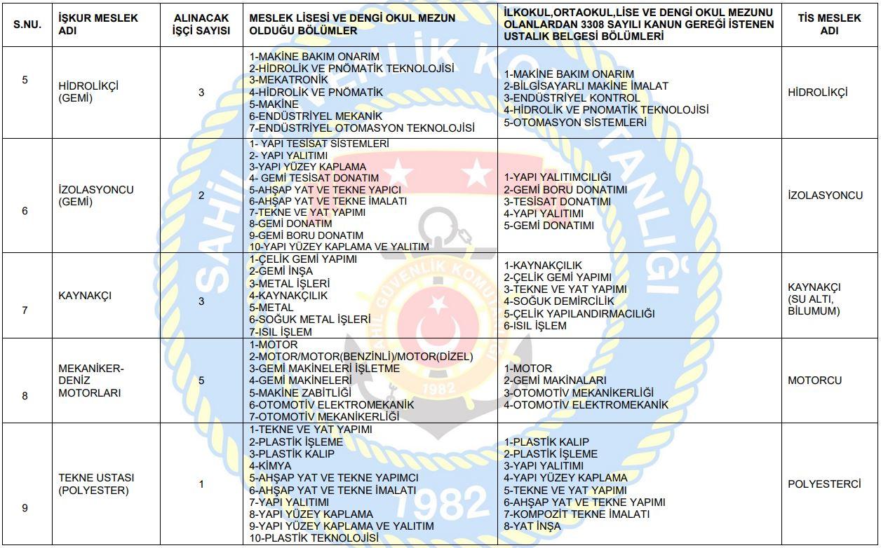 Sahil Güvenlik Komutanlığı bağlısı, Sahil Güvenlik Akdeniz Onarım Destek Komutanlığı (Akdeniz/MERSİN) işyerinde istihdam edilmek üzere, 4857 sayılı İş Kanunu ile Kamu Kurumu ve Kuruluşlarına İşçi Alınmasında Uygulanacak Usul ve Esaslar Hakkında Yönetmelik hükümleri uyarınca 657 sayılı Devlet Memurları Kanununun 4/D maddesi uyarınca Türkiye İş Kurumu (İŞKUR) aracılığıyla 31 sürekli işçi alımı yapılacaktır.