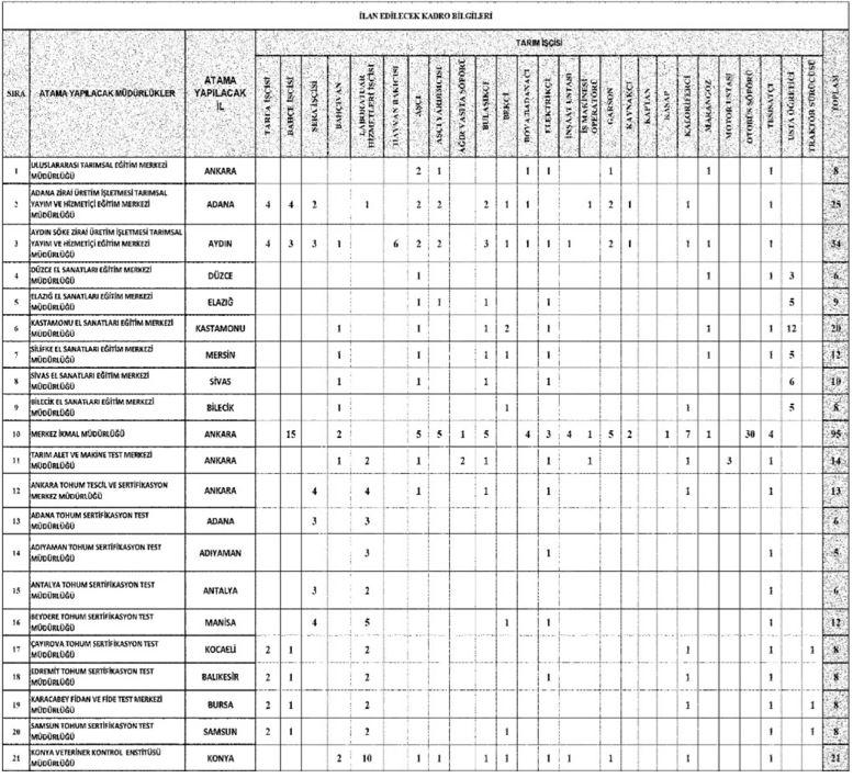 Bakanlık doğrudan merkeze bağlı taşra teşkilatında istihdam edilmek üzere, 1500 Tarım İşçisi alımı yapılacaktır. Alım yapılacak kontenjanlar ise şu şekildedir: