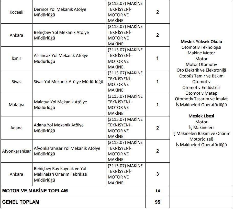 TCDD belirsiz süreli iş sözleşmesiyle 12 kaynakçı (oksijen ve elektrik), 69 makine bakımcı ve 14 makine teknisyeni – motor ve makine (motor tamircisi) olmak üzere 95 işçi alacak. İş gücü talepleri KPSS şartı aranmaksızın 19.02.2024 – 23.02.2024 tarihleri arasında ülke düzeyinde çalışma adresine göre İŞKUR’da yayınlanacaktır. Başvuru yapacak adayların bilmesi gereken hususlar, özel şartlar, istenilen belgeler ve okul bölümleri aşağıda belirtilmiştir