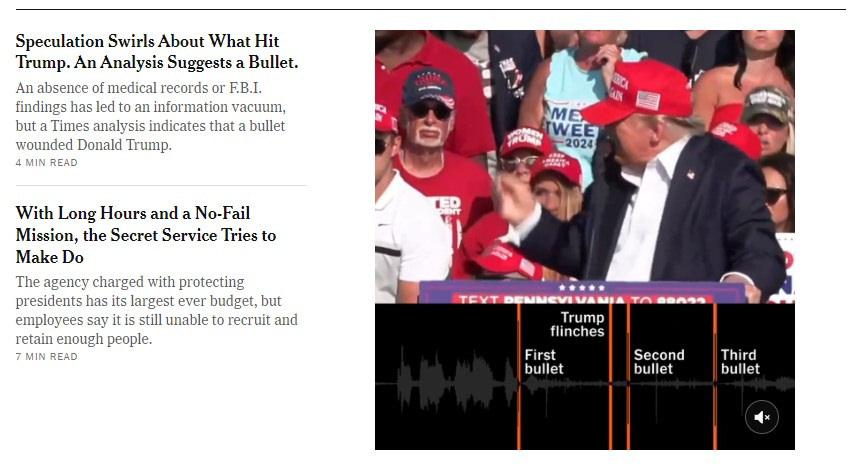 New York Times gazetesinde video analizlerden yararlanılarak yayımlanan raporda Trump’ın merminin sağ kulağını sıyırması sonucu yaralandığı belirtildi. Trump’ın, suikast girişimi zanlısı Thomas Matthew Crooks’un ateşlediği 8 merminin ilkiyle yaralandığına işaret edilen raporda, Federal Soruşturma Bürosunun (FBI) olay yerindeki metal parçalarını incelediği kaydedildi.