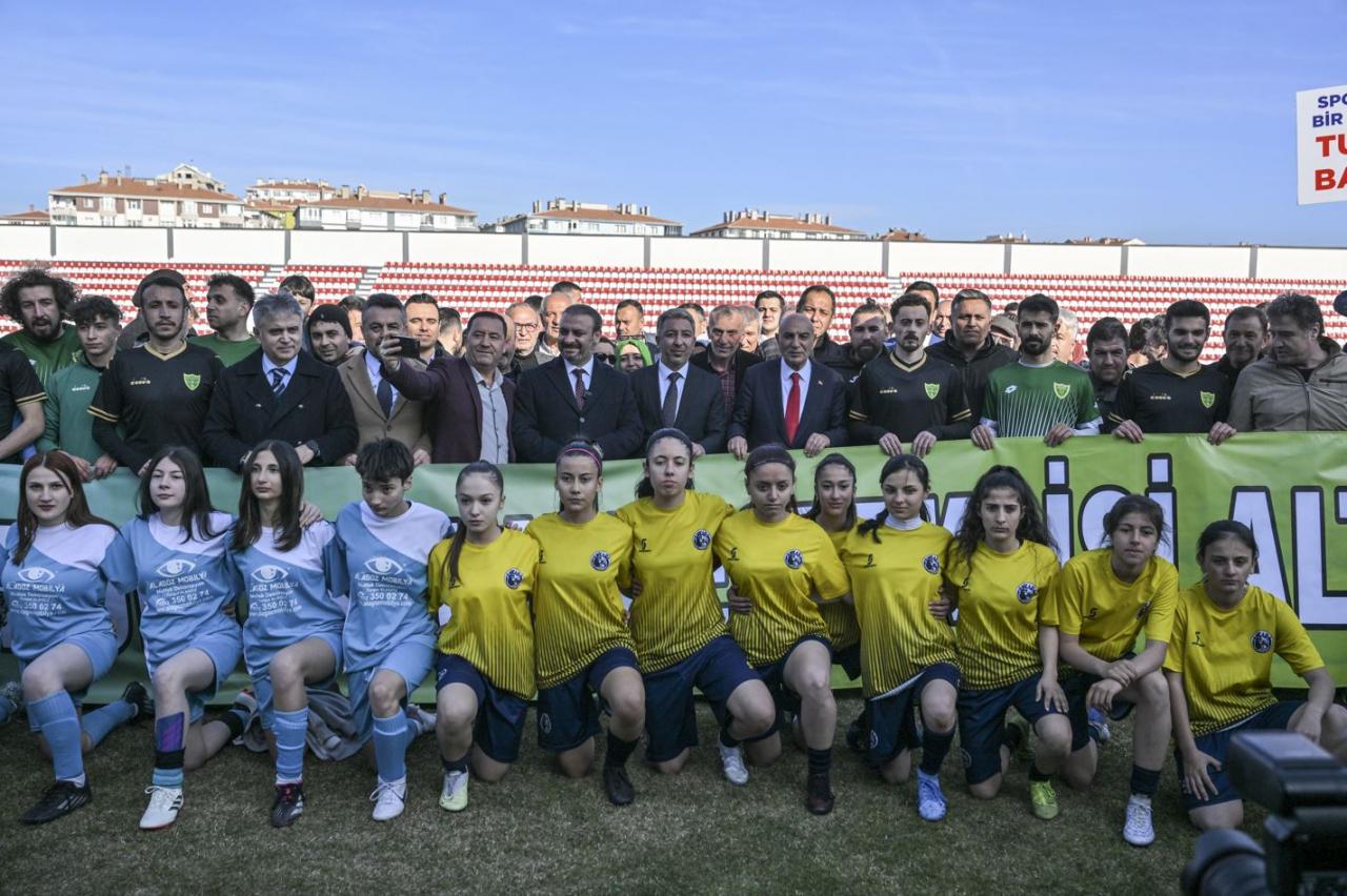 Altınok, konuşmasının ardından stadyum içinde sporcularla fotoğraf çektirdi ve penaltı vuruşu yaptı.