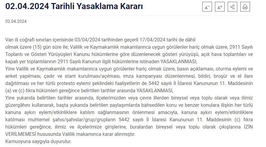 Açıklamada, “Bitlis coğrafi sınırları içerisinde 03/04/2024 tarihini saat:00.01’den 17/04/2024 tarihi saat:23.59’a kadar (15) gün süre ile valilik ve kaymakamlık makamlarınca uygun görülenler hariç olmak üzere, 2911 Sayılı Toplantı ve Gösteri Yürüyüşleri Kanunu hükümlerine göre düzenlenecek gösteri yürüyüşü, açık hava toplantıları ve kapalı yer toplantılarının 2911 Sayılı Kanun’un ilgili hükümlerine istinaden yasaklanması, valilik ve kaymakamlık makamlarınca uygun görülenler hariç olmak üzere, basın açıklaması, oturma eylemi ve anket yapılması, çadır ve stant kurulması/açılması, imza kampanyası düzenlenmesi, bildiri, broşür ve el ilanı dağıtılması ve her türlü protesto eylemi şeklindeki faaliyetlerin de 5442 sayılı İl İdaresi Kanunu’nun 11. Maddesinin (a) ve (c) fıkra hükümleri gereğince belirtilen tarihler arasında yasaklanması, yine yukarıda belirtilen tarihler arasında, ilçelerimizden veya çevre illerden bireysel veya toplu olarak veya ilimiz güzergâhını kullanarak, başta yukarıda belirtilen örgütsel çağrılarda bahsedilen konu ve benzer konulara ilişkin her türlü kanuna aykırı eylem/etkinliklere katılım sağlanmasının önlenmesi amacıyla, kanuna aykırı eylem/etkinliklere katılması muhtemel şahıs/şahıslar/grup/grupların 5442 sayılı İl İdaresi Kanununun 11. Maddesinin (c) fıkra hükümleri gereğince, ilimiz ve ilçelerimize girişlerine, buralardan bireysel veya toplu olarak çıkışlarına izin verilmemesine karar verilmiştir” denildi.