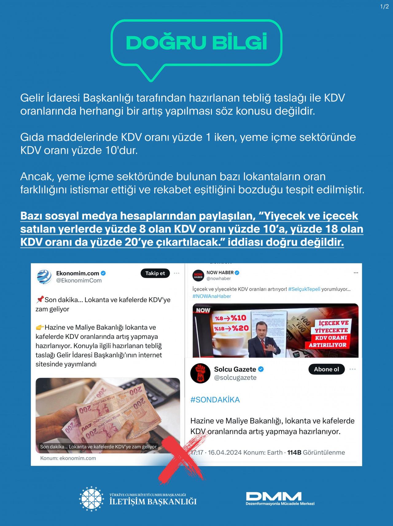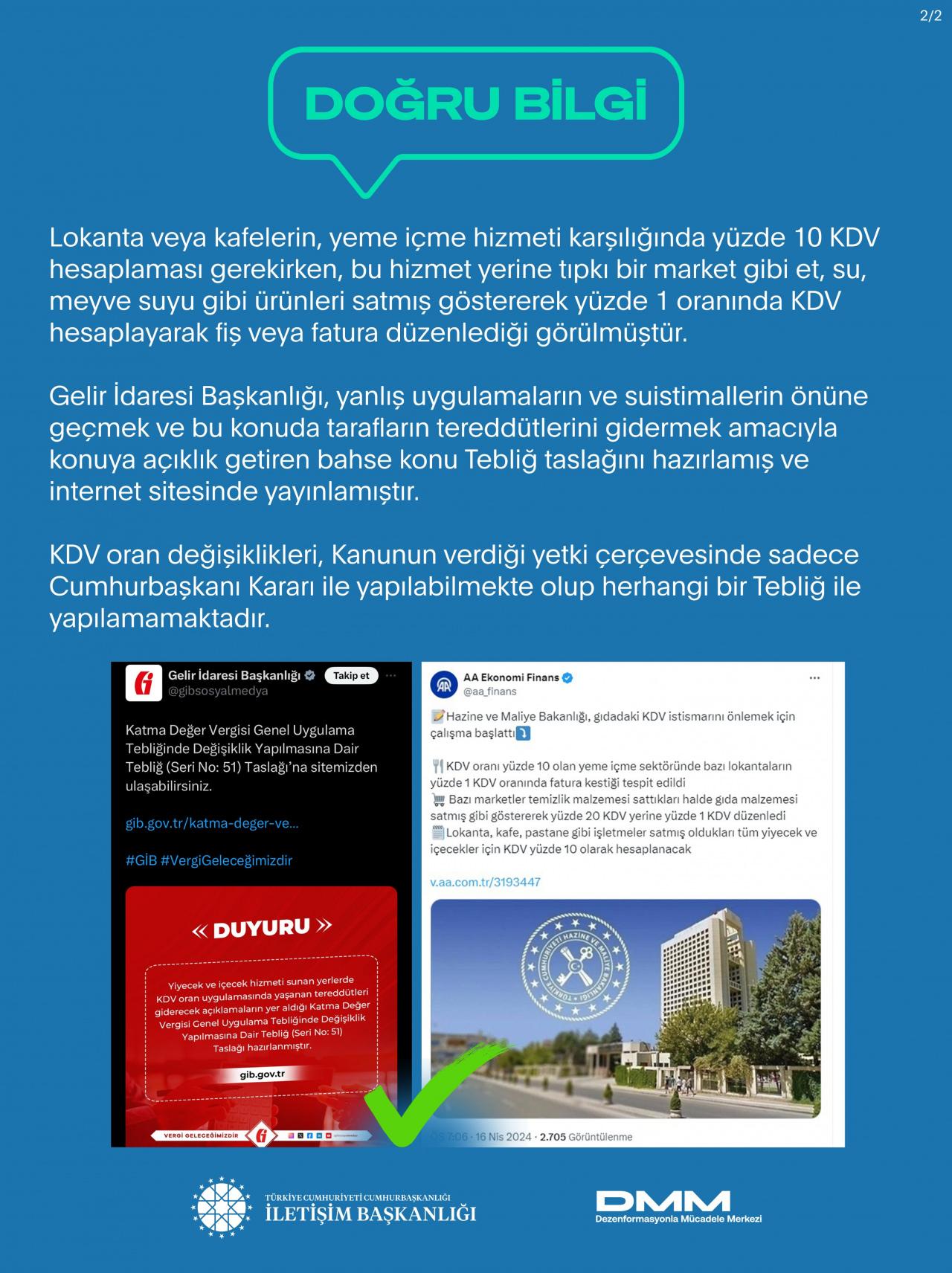 Bazı sosyal medya hesaplarından paylaşılan, “Yiyecek ve içecek satılan yerlerde yüzde 8 olan KDV oranı yüzde 10’a, yüzde 18 olan KDV oranı da yüzde 20’ye çıkartılacak.” iddiası doğru değildir. Gelir İdaresi Başkanlığı tarafından hazırlanan tebliğ taslağı ile KDV oranlarında herhangi bir artış yapılması söz konusu değildir. Gıda maddelerinde KDV oranı yüzde 1 iken, yeme içme sektöründe KDV oranı yüzde 10’dur. Ancak, yeme içme sektöründe bulunan bazı lokantaların oran farklılığını istismar ettiği ve rekabet eşitliğini bozduğu tespit edilmiştir.