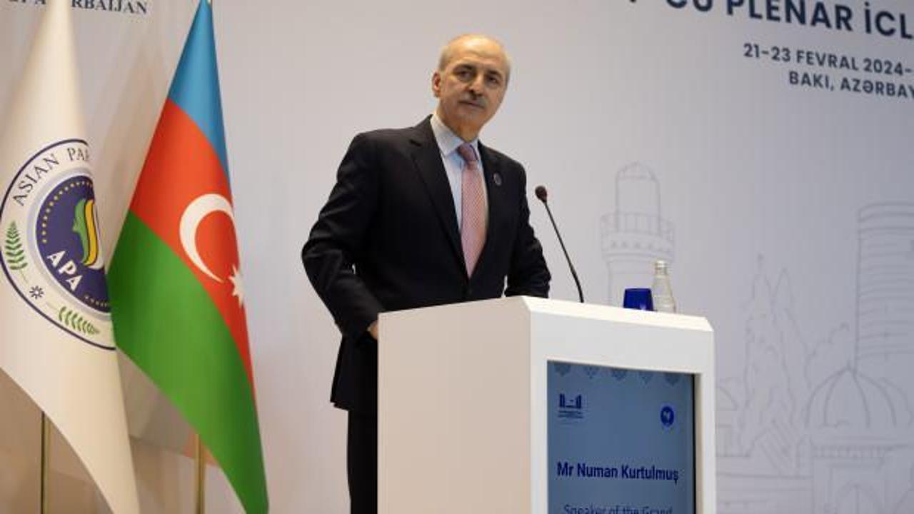 TBMM Başkanı Kurtulmuş, Azerbaycan'ın başkenti Bakü'de 'Asya'da Sürdürülebilir Kalkınma için Bölgesel İşbirliğinin Teşvik Edilmesi' temasıyla Azerbaycan Milli Meclisi'nin ev sahipliğinde düzenlenen Asya Parlamenter Asamblesi (APA) 14'üncü Genel Kurulu'nda konuştu. Kurtulmuş, toplantıda ortaya konulacak fikirlerin, yapılacak müzakerelerin Asya ülkeleri arasında dayanışma ve iş birliğini sağlayacak önemli sonuçlar doğurması temennisinde bulunarak, dünyanın zor bir dönemden geçtiğini, bu çerçevede tarihsel olarak Asya'da da önemli tarihi fırsat penceresinin açıldığını söyledi.